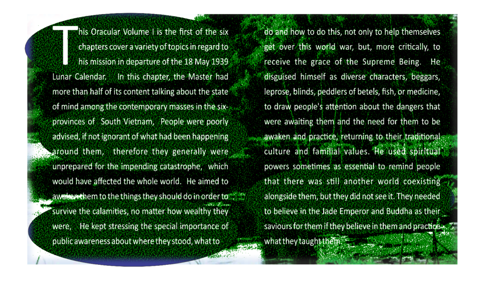 This is the first volume which Lord Master composed while at the Foundation House (Hoa Hao Sacred Site) about Mid August (1939). He wrote in a pairs of 7 syllable and pairs of 6 and 8 syllables, telling His story and exhortation, 912 verses.